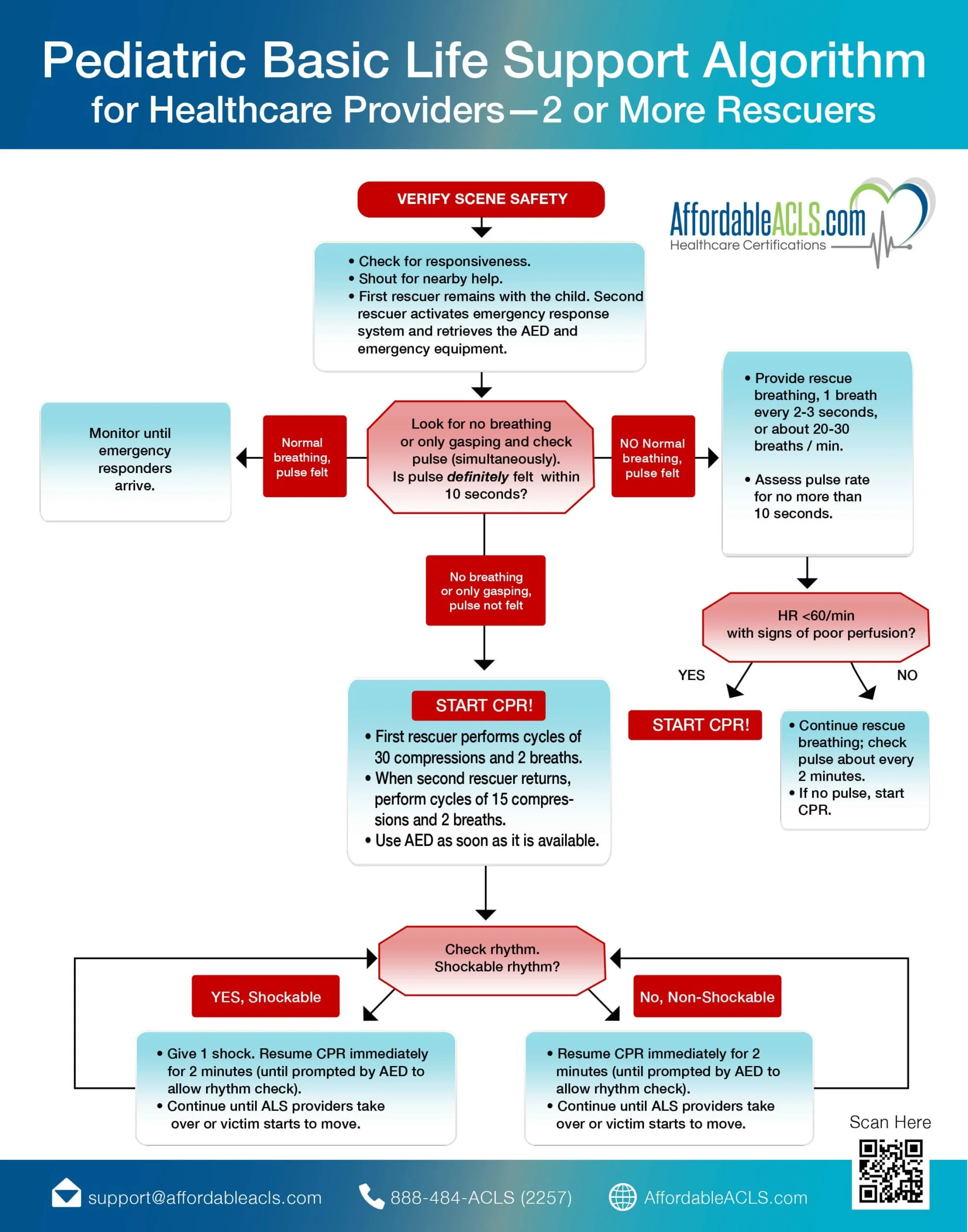 The Pediatric Basic Life Support Algorithm is the foundational pathway for pediatric BLS when 2 or more rescuers are present. It Includes scene safety, compressions, ventilation, and AED use. It also includes activation of the EMS system.